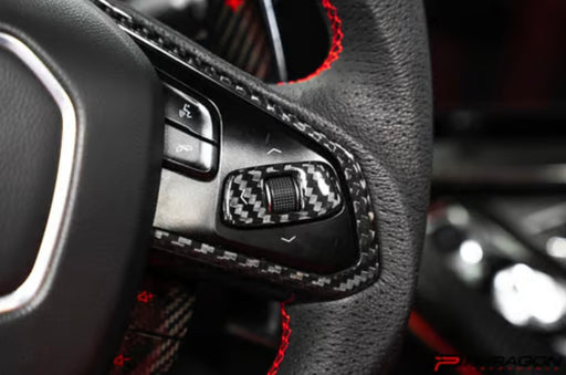 Add a subtle touch of carbon fiber to your C8 Corvette steering wheel by covering the silver trim around your button cluster with the CCS Carbon Fi...